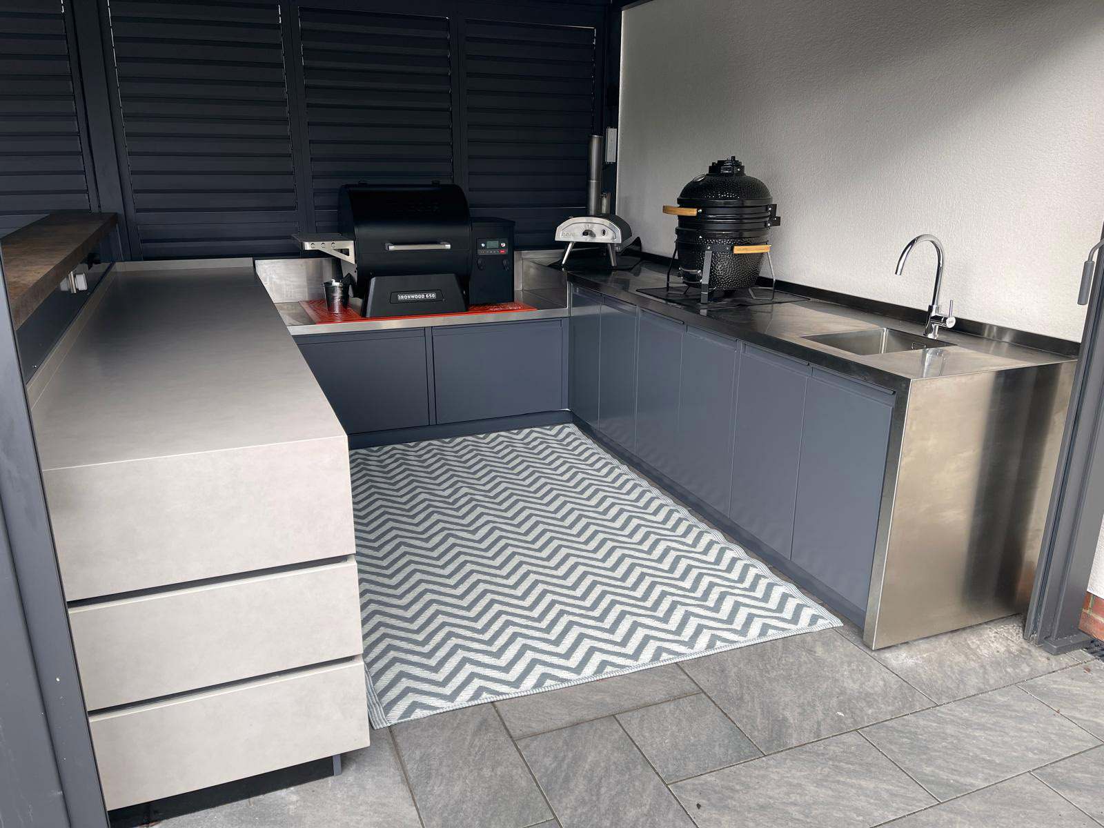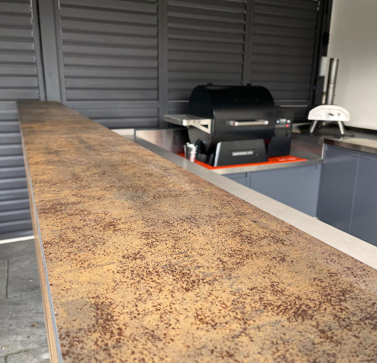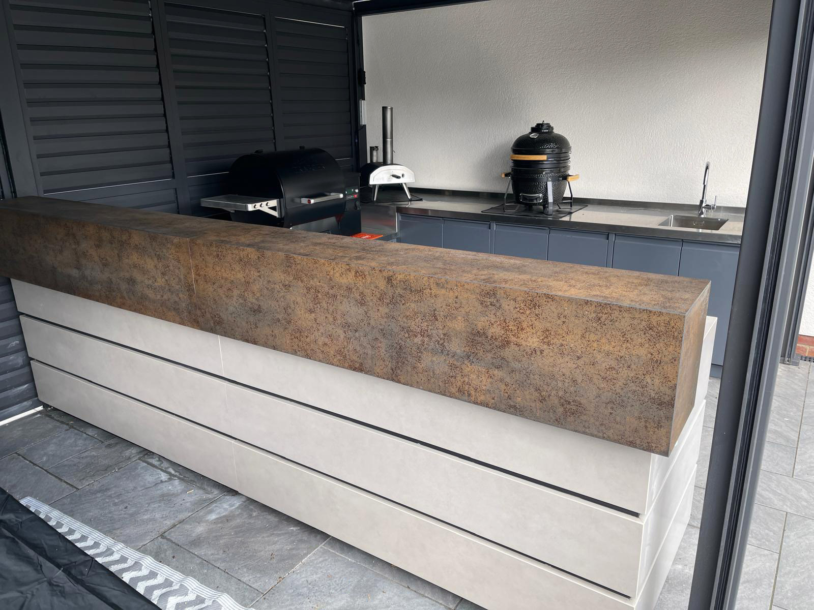 Beneath the stone top, the cupboards were constructed entirely from stainless steel, ensuring a highly durable structure capable of withstanding outdoor conditions. To soften the aesthetic and improve longevity, all cupboard doors and panels were finished with a grey powder-coated coating. This protective finish provides a hard-wearing surface that not only enhances the visual appearance but also delivers long-term hygiene and corrosion protection.