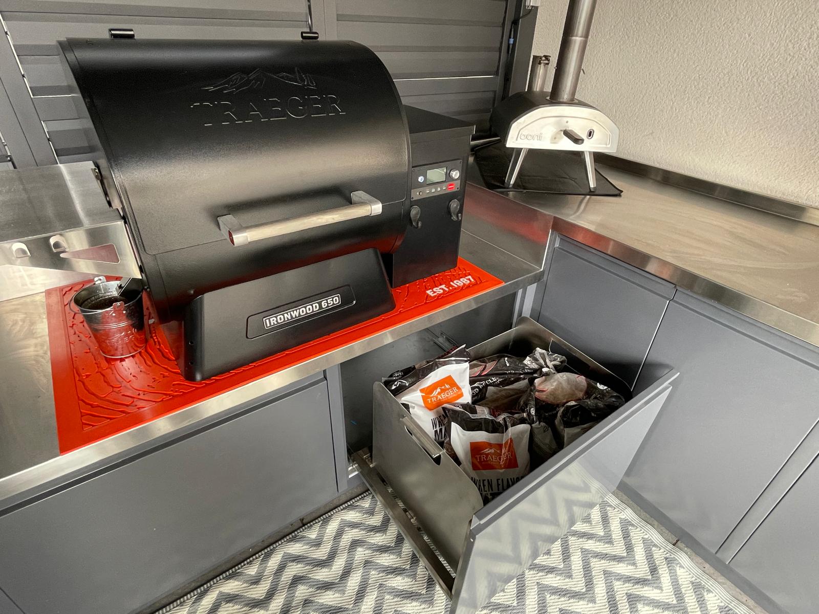 - Stainless steel storage drawers designed specifically to store charcoal and logs